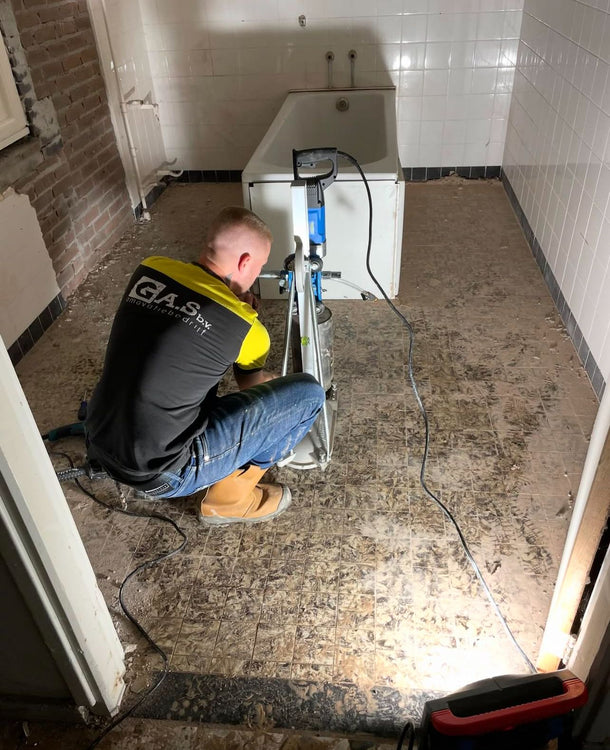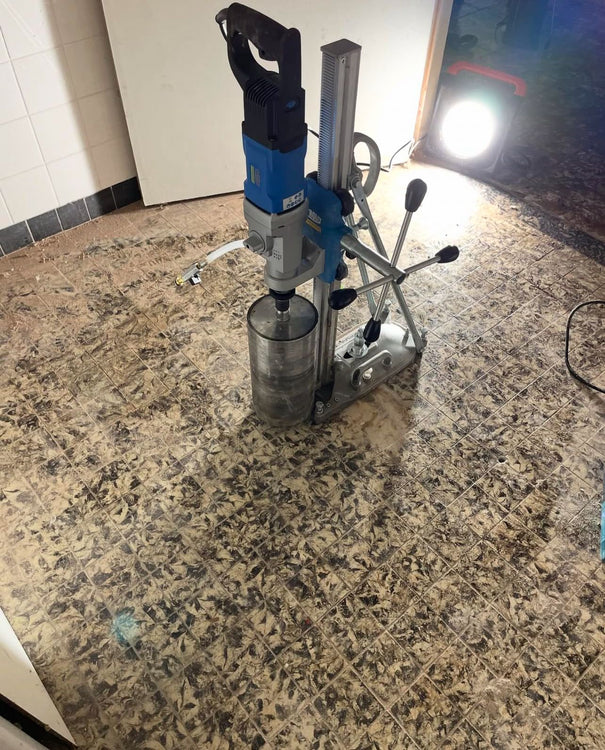 Voor grotere boorgaten maken we gebruik van geavanceerde boormachines op een boorstatief, wat zorgt voor maximale stabiliteit en waterkoeling om het werk schoon en efficiënt te houden.